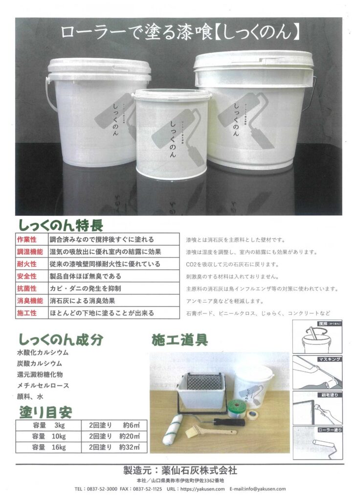 しっくのんは消石灰、水、還元澱粉(でんぷん)糖化物を主原料としており、ほぼ無臭です。